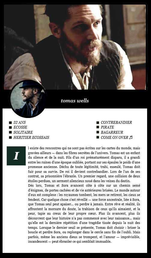 _ Ton bonheur est le mien Sora. Et puis ce ne sont pas des adieux. »Je suis stupéfaite par sa décision.. et aussi parce qu’elle me confie à Tomas. Il devait s’en aller, s’éloigner.. et au final il va partir avec moi ? Est-ce que ma mère l’a menacé ? Ou promis de l’argent ? Ou veut-il vraiment m’avoir auprès de lui ? Pour l’instant je ne peux pas le questionner puisque ma mère est présente. Elle quitte la chambre en disant aller préparer le déjeuner et c’est là que je me retrouve seule face à lui. Ma chambre n’est pas lumineuse et il est caché par une pénombre mais je vois ses contours. J’entends aussi sa respiration lourde.